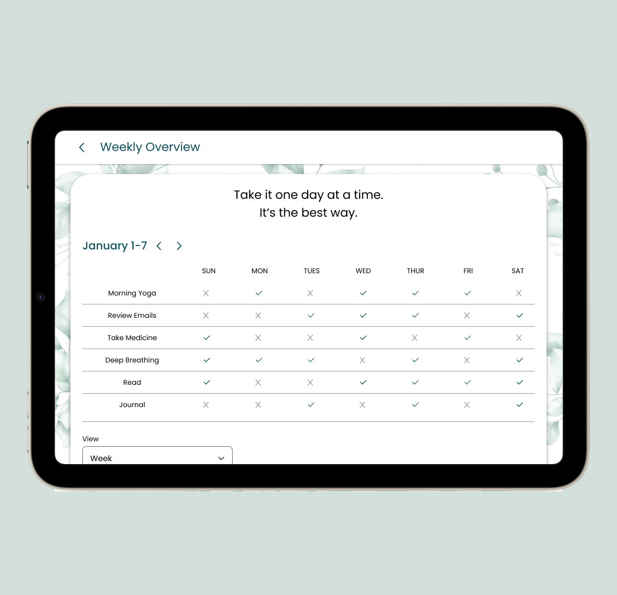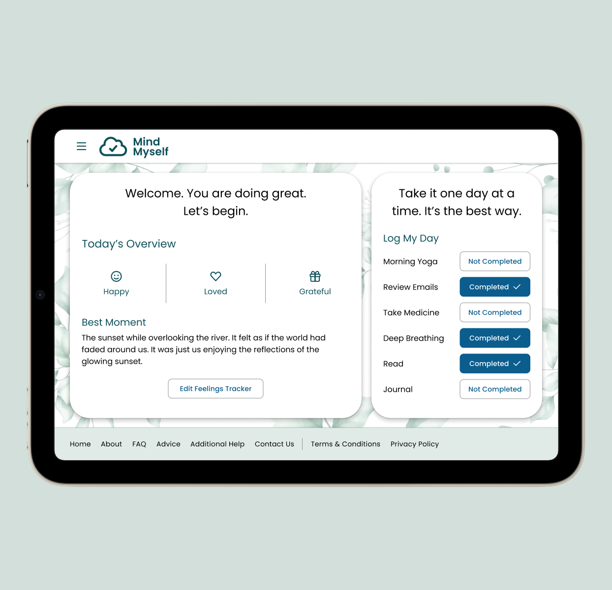 The end goal for Mind Myself is to provide users with a relaxing; and calming experience without overstimulation or exertion on streamlining their life or helping them with their memory impairments.